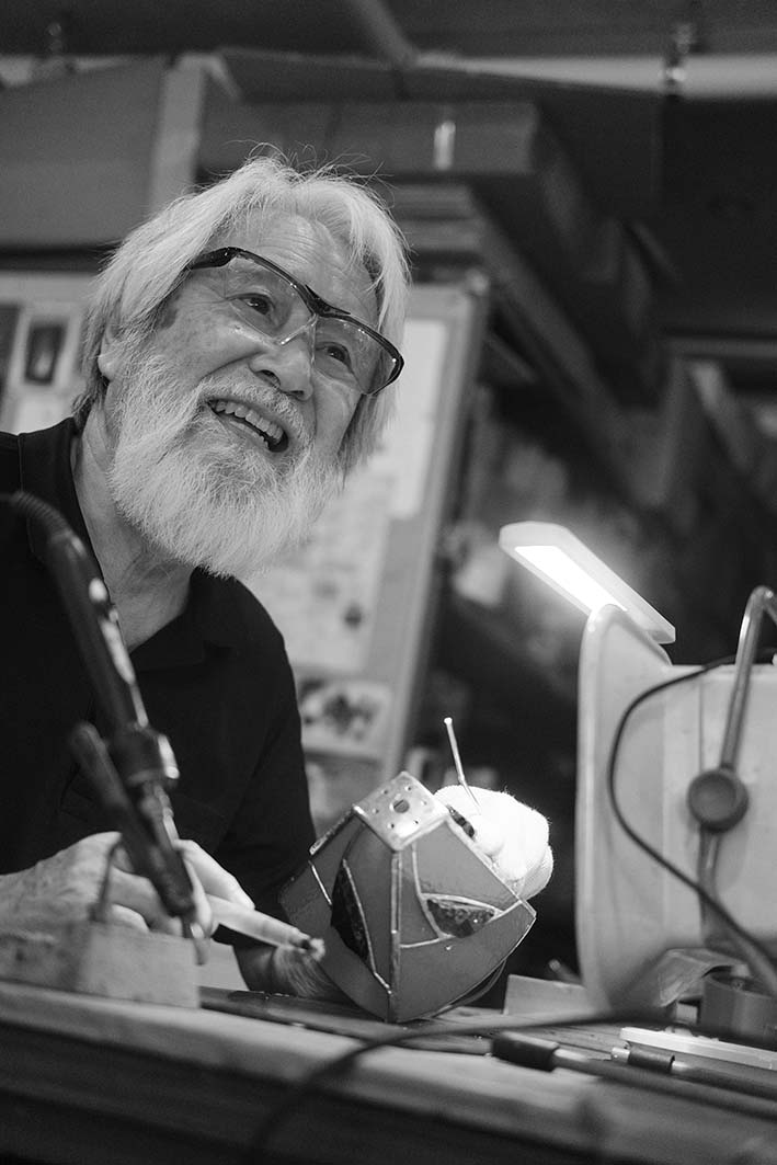 「開校の前年に多摩美術大学でガラス工芸科が開設されるなど、ようやくガラス工芸の専門教育が受けられるようになってきたときでした。人間国宝・濱田庄司の四男、ガラス作家の濱田能生(1944-2011)先生に師事し、濱田先生の窯を見せてもらって窯のつくりかたから学びました。長崎に戻ると工房をつくりガラス製作を始め、主にステンドグラスの制作を行いました。」